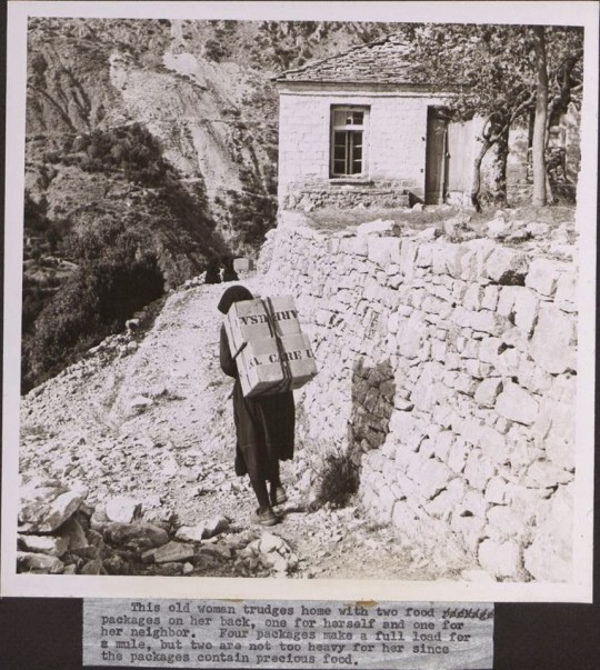 Στον Τσαμαντά, παιδιά κάθονται πάνω σε πακέτα της αμερικάνικης βοήθειας και μια γριά κουβαλάει στην πλάτη της δυο πακέτα. (Harvard University Library).