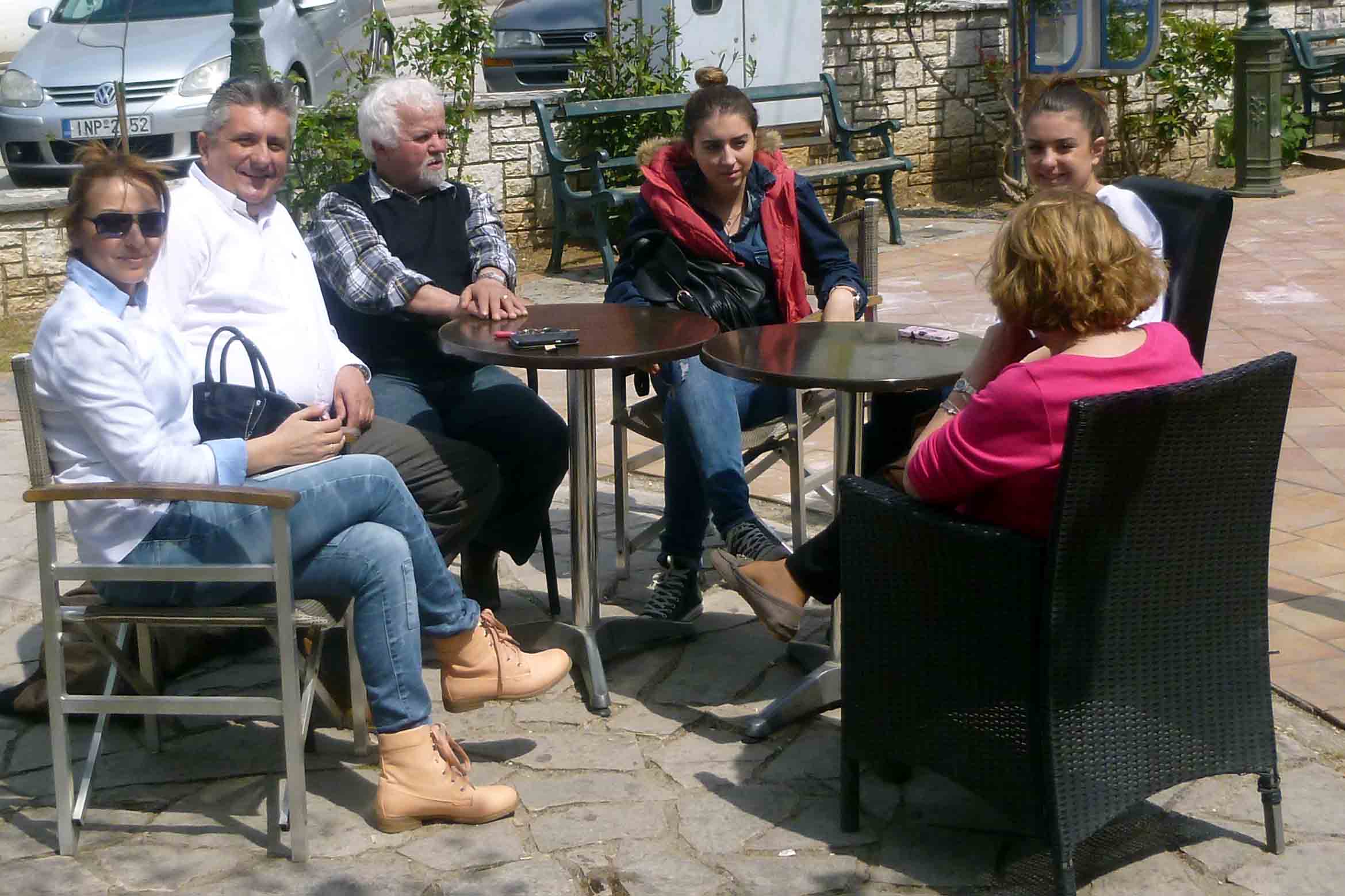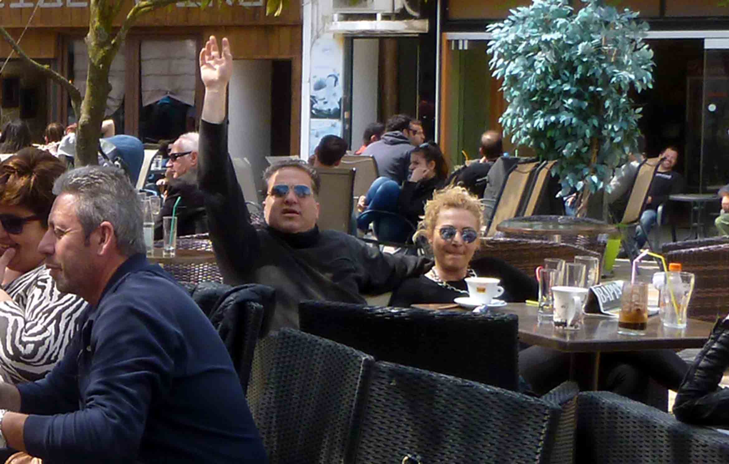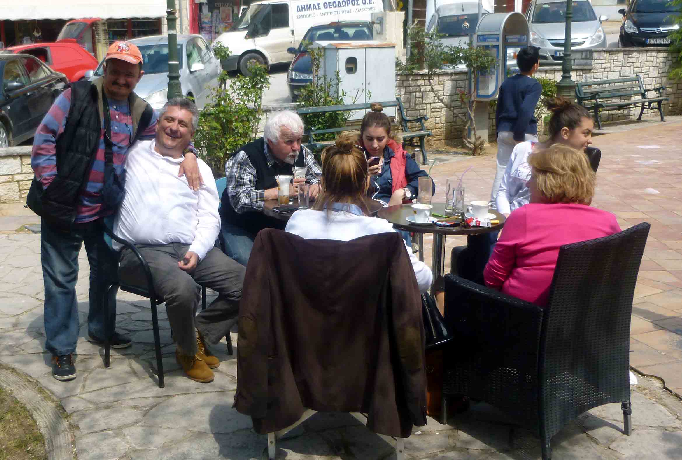 Ο Γιώργος Τσώνης, γιός του αείμνηστου Λευτέρη, με την κυρία του και με την παρέα του, Βασίλης Μπολόφης και η Έλενα Καλαμπάκα που απολαμβάνει νωχελικά την πάνω πλατεία… που της λείπει…