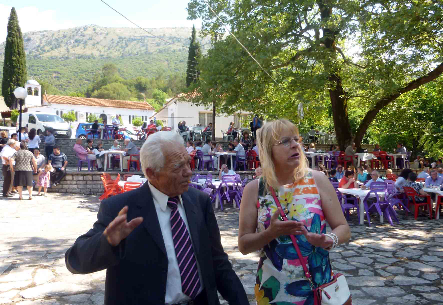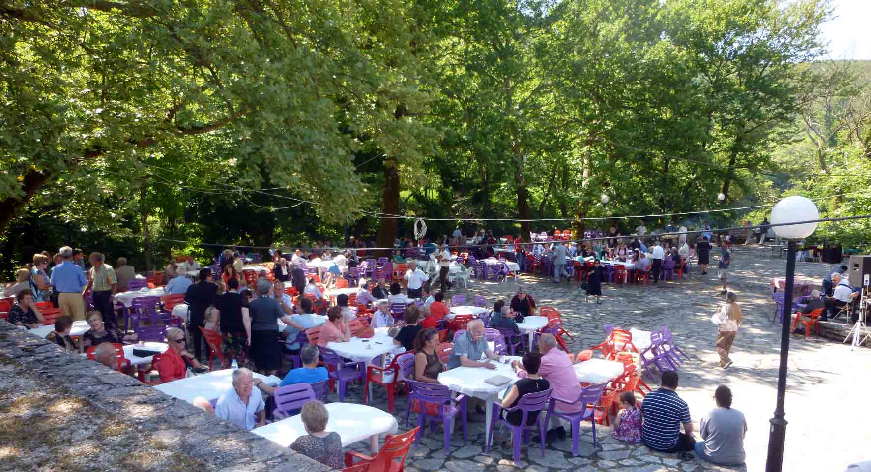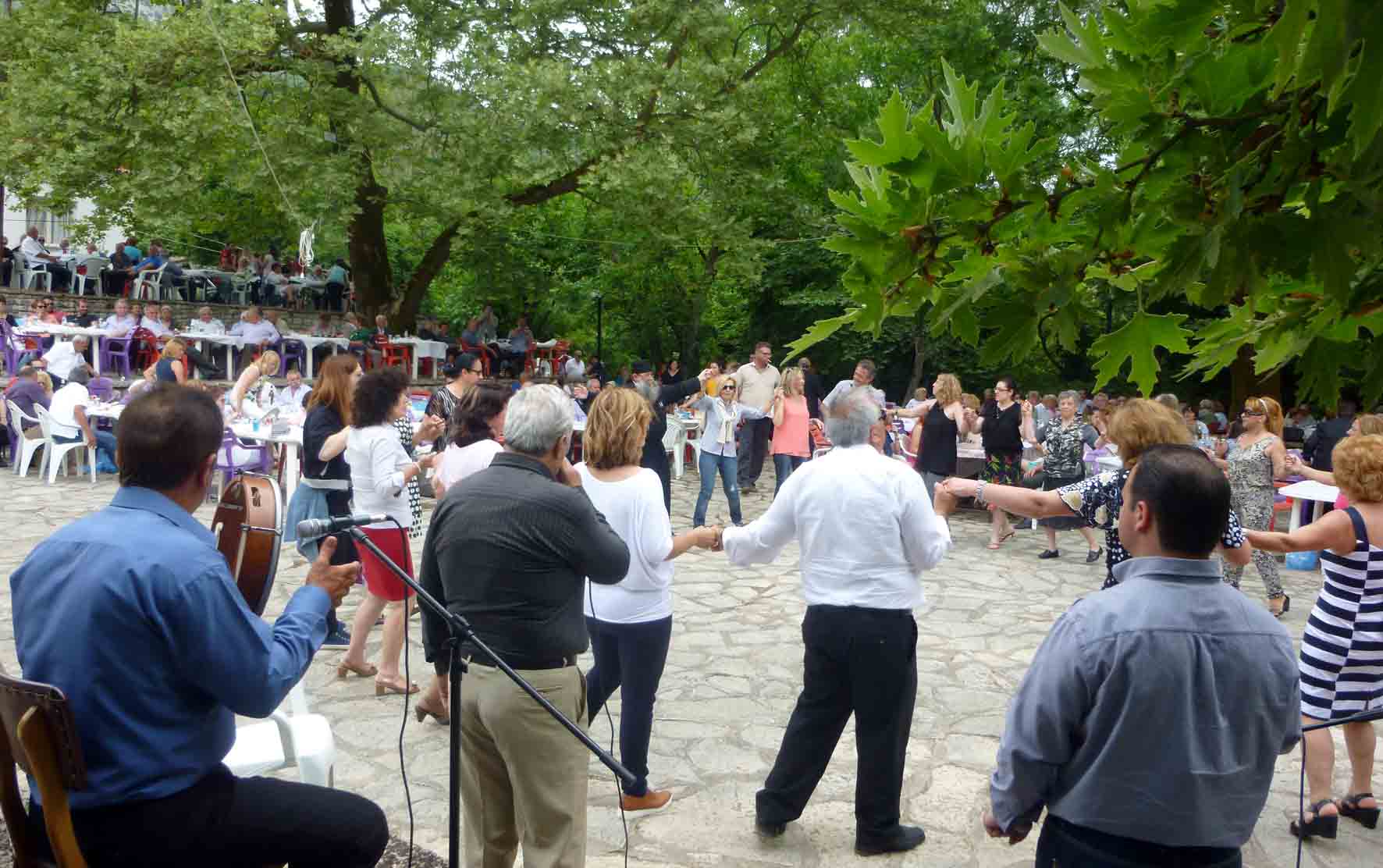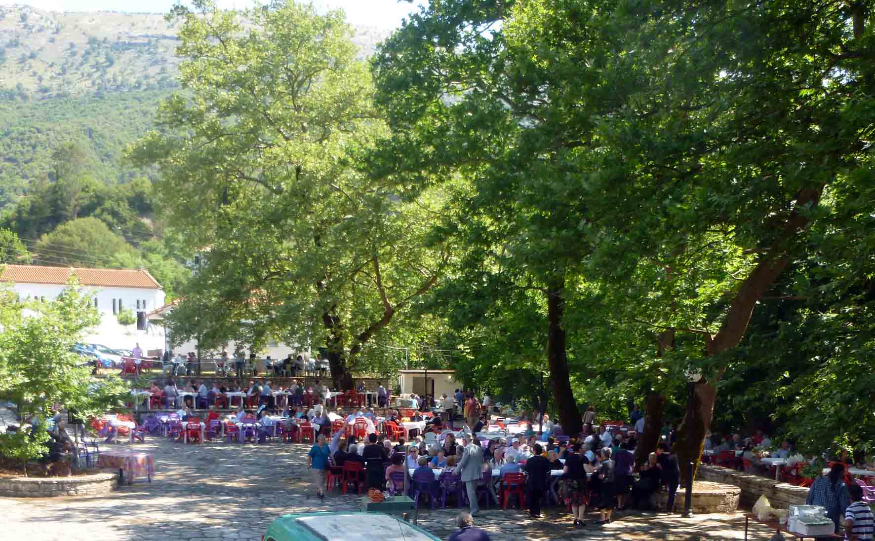 Τα σύννεφα έπαιζαν κρυφτό με τον ήλιο, το πρωί της Κυριακής 7 Ιουνίου, στα ριζά της Πλόκιστας. Κατάμεστη από κόσμο η εκκλησία των Αγίων Πάντων, αφού πέρα από τους ντόπιους και τους ξενιτεμένους είχαν έρθει και 70 άτομα από το ΚΑΠΗ Ηγουμενίτσας. Ναι, ήταν αρκετοί ξενιτεμένοι, ¨έχω πολλά χρόνια να τύχω στο πανηγύρι του χωριού¨ μας εξομολογήθηκε συγκινημένος ο φίλος Παύλος Σούφλας, που δεν χόρταινε να τραβά φωτογραφίες και βίντεο. Σαν τέλειωσε η θεία λειτουργία κόσμος πολύς κατέκλυσε τον όμορφο χώρο της πλατείας με τα πλατάνια και το ποταμάκι δίπλα. Πολλές φορές οι διοργανωτές αναγκάστηκαν να προσθέσουν τραπέζια και καθίσματα- αφού οι πανηγυριστές ξεπέρασαν τους 600.