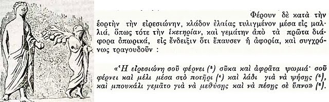 Τα παιδιά γύριζαν από σπίτι σε σπίτι, κρατώντας ελιάς ή δάφνης στολισμένα με μαλλί (σύμβολο υγείας και ομορφιάς) και καρπούς κάθε λογής, τραγουδώντας για καλύτερη τύχη και γονιμότητα της γης. Πολλά από τα παιδιά έφεραν τον κλάδο σπίτι τους και τον κρεμούσαν στην πόρτα όπου έμενε όλο το έτος.(κάτι που συνηθίζουμε να κάνουμε σήμερα την Πρωτομαγιά).
