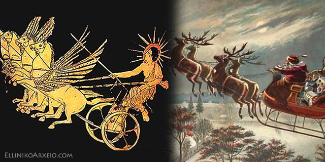 Φυσικά μεγάλη εντύπωση προκαλεί και το μυθολογικό γεγονός του «Αγιοβασίλη» με το έλκηθρο του που το κινούν οι ιπτάμενοι τάρανδοι. Ούτε αυτό όπως καταλαβαίνετε, δεν θα μπορούσε να μην παρθεί απο την Αρχαία Ελλάδα. Όπως αναφέραμε πιο πρίν , τον μήνα Δεκέμβριο, οι Έλληνες γιόρταζαν τον Διόνυσο αλλά και τον Φωτοφόρο Απόλλωνα-Ηλίου παριστάνοντας τον πάνω στο ιπτάμενο άρμα του, να μοιράζει το φως. Το άρμα έγινε έλκηθρο, τα άλογα έγιναν τάρανδοι και το «δώρο» του φωτός που μοίραζε στους ανθρώπους …έγινε κυριολεκτικά «μοίρασμα δώρων».
