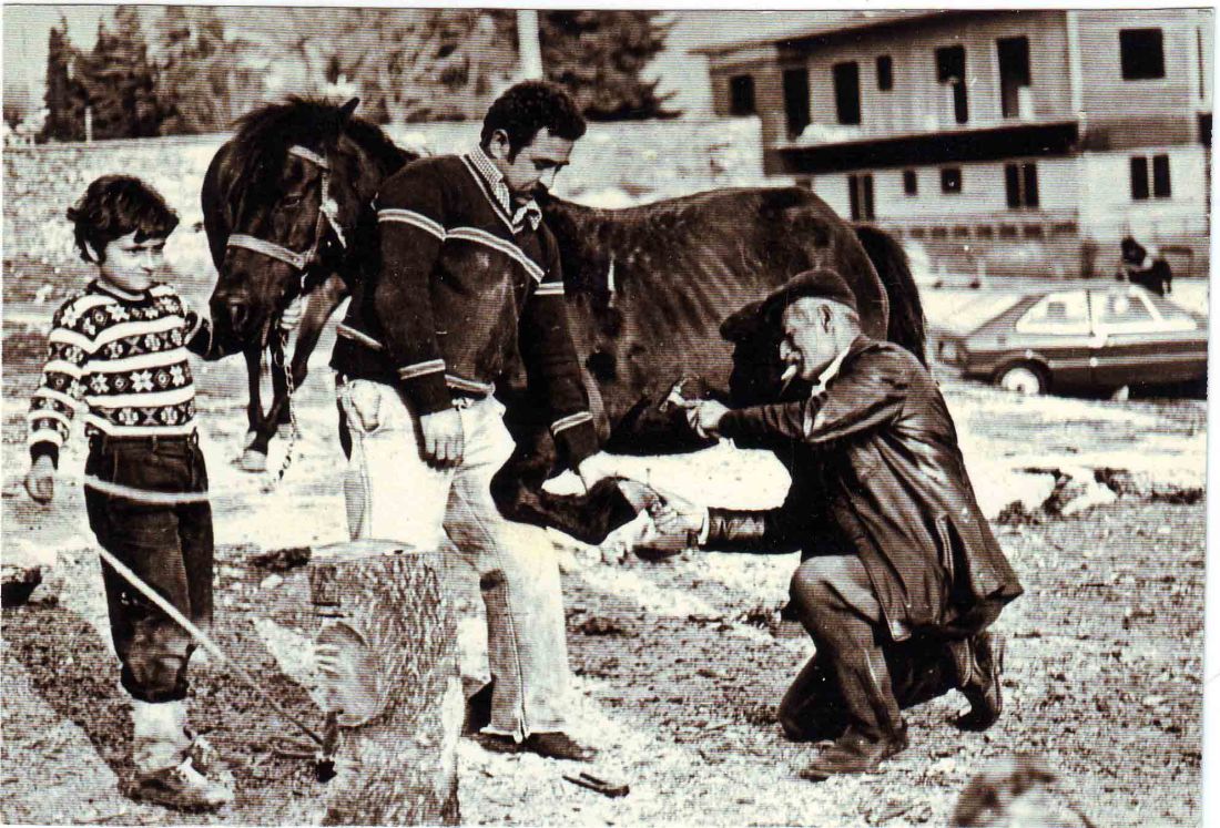 Ο Γιάννης Δημητρίου (Κολιομύτης;) πεταλώνει τ’ άλογο που κρατάει ο Βαγγέλη Στέφος (τζές) και τους καμαρώνει ο γιός του… κάτω απο το παλιό γήπεδο!