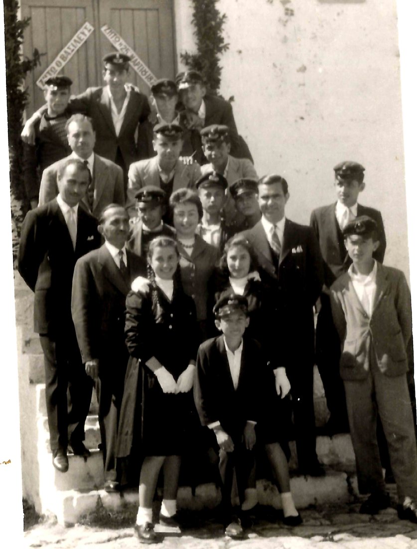 Από αριστερά, Παύλος Φραγκίσκος, Γιώργος (Γάκης) Κύρκος- αρχιμουσικός τότε, Όλγα Κύρκου, Γεωργία Διαμάντη, Χρυσόστομος Ζούλας,;, Φωτούλα, Φραγκίσκου, Πίπης Φραγκίσκος- με τη στολή της Φιλαρμονικής, δίπλα του Πίπη η Ευτυχία Ζούλα και εμπρός η Νανά Ζούλα, Χόρη Αλεξίου, Μπούλα Αλεξίου,;,  Θόδωρος Καραγιάννης- με τη στολή της Φιλαρμονικής και μάλλον ο Γρηγόρης Οικονόμου