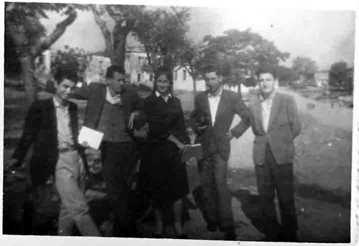 Η πρώτη φωτογραφία είναι τραβηγμένη στην σημερινή κάτω πλατεία, πίσω είναι το τότε Γυμνάσιο και είναι μαθητές του Γυμνασίου της δεκαετίας του ’50- από δεξιά πρέπει να είναι ο Κλεόβουλος ο Σίσκος, 2ος άγνωστος, 3η ίσως η Λιλή η Μικρούλη, 4ος ο Βαγγέλης ο Αγγελόπουλος και 5ος πιθανόν ο Σωτήρης Καραμπίνας.