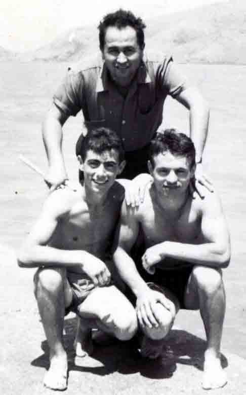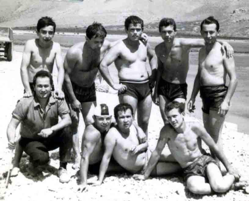 Εκεί μας ξεφόρτωνε το λεωφορείο και ορμούσαμε μέσα στη θάλασσα. Ούτε ομπρέλες για τον ήλιο, ούτε ξαπλώστρες, ούτε πετσέτες δεν είχαμε. Για μαγιό είχαμε κάτι σκούρα βρακιά- σκελέες. Κάπου κάπου έπλεε και καμιά σαμπρέλα, το σωσίβιο του καιρού. Η νεολαία πηγαίναμε στο μόλο για βουτιές, εκεί γινότανε χαμός. Άλλος έσπρωχνε, άλλος τράβαγε τον άλλο να πάνε μαζί μέσα στη θάλασσα, άλλοι έκαναν φιγούρες με τις βουτιές. ποιος θα κάνει την καλύτερη γωνία, ποιος θα κάνει το καλύτερο ¨κοφινέτο¨ και ποιος το μεγαλύτερο μακροβούτι. Στον μόλο μαζί με τη νεολαία έρχονταν και κάποιοι τολμηροί μεγαλύτεροι. Θυμάμαι τον αείμνηστο Χρήστο Τσούβαλο, που ήταν πάντα μέσα σε όλα, έρχονταν στο μόλο και έπαιζε κι αυτός μαζί μας. Αυτός είχε συνήθειο την πρώτη βουτιά που έκανε να σηκώνει τα χέρια του ψηλά πριν πέσει και να λέει ¨χαίρε βάθος αμέτρητο¨. Έτσι έκανε μια μέρα αλλά δεν πρόλαβε να πέσει μόνος του, κάποιος τον έσπρωξε από πίσω. Όμως δεν έπεσε καλά και χτύπησε το κεφάλι στο τσιμέντο του μόλου. Γέμισε η θάλασσα αίματα κι είπαμαν κι εμείς πάει ο Χρηστάρας δεν θα βγει πάλι. Σηκώθηκε το νερό μισό μέτρο και βγήκε ο γίγαντας ματωμένος και αγριεμένος, ¨ποιος με έσπρωξε ρε¨. Άμα τον είδαμε ζωντανό χαρήκαμε και τρέξαμε όλοι να τον βοηθήσουμε. Δεν είχε χτυπήσει πολύ και δεν είχε ανάγκη από τέτοιο χτύπημα το κεφάλι του Τσούβαλου. Μετά από λίγο άρχισε πάλι τα παιχνίδια. Το πολύ μπάνιο και τα πολλά παιχνίδια μας φέρνανε πείνα, τρέχαμε στη μοναδική τότε στην παραλία παραδοσιακή ταβέρνα του εξίσου παραδοσιακού ταβερνιάρη Γιάννη Κόρου. Εκεί θα βρίσκαμε φρέσκο πάμφθηνο ψάρι, σαλάτες, χόρτα, μπύρες, ουζάκια και αναψυκτικά. Η ώρα πέρναγε γρήγορα, το λεωφορείο κορνάριζε κι εμείς φοράγαμε τις λαστιχένιες παντόφλες και μαζευόμασταν για την επιστροφή. Άλλοι στεγνοί κι άλλοι μισοβρεγμένοι που τους φώναζε ο εισπράκτορας ¨εσένα θα σε βάλω στη σκάρα, θα μου μουσκέψεις το αμάξι, και φεύγαμε ευτυχισμένοι. Δεν ζητούσαμε πολλά τότες. Σε αυτή τη φωτογραφία είναι: Σιορόκος, Τσιάβο Παρούσης, Ηλία Καραμπίνας, Κίτσιο Κουφάλας και Βασίλη Μπίμης, κάτω: Παύλο Μαντέλος, Κώστα Γκιζάς, Νικολάκης Μαντέλος κι ο Σπύρο Κουφάλας.