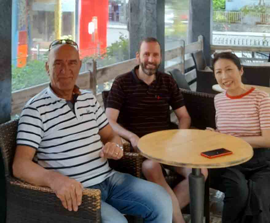 Είναι η τρίτη φορά που επισκέπτονται το Φιλιάτι ο Ραφαήλ Μπακόλας- Αρχιτέκτονας στην Αγγλία και η σύντροφός του Τομόκο- Ανθρωπολόγος. Τον Ραφαήλ τον συνδέει με το Φιλιάτι το ότι έζησαν εδώ μέλη της οικογένειάς του πριν 100 χρόνια και εκδηλώνει την αγάπη του γι’αυτό με μια ιδιαίτερη ευαισθησία.Η οικογένειά του έφυγε από το Φιλιάτι το 1927, εγκαταστάθηκε στην Κέρκυρα και μετά στην Αθήνα. Ο Ραφαήλ είδε στο διαδίκτυο πριν 3 χρόνια κάποιες αναφορές μου για τους Εβραίους των Φιλιατών και μας επισκέφτηκε εξερευνώντας με ευλάβεια τα χνάρια των προγόνων.