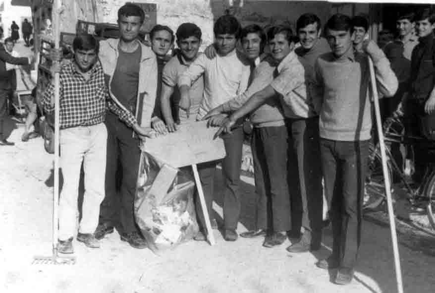Συμ- Μαθητές καθαρίζουν την πόλη, έξω από τα ποδοσφαιράκια του Πέτρο Νέτη, από αριστερά: Χρήστος Τσίμος, Χριστόφορος Θεοδώρου, Γιάννης Κούλας, Μίλτος Ντουμάζιος, Γιάννης Παπαδόπουλος, Σταυρόπουλος, Άρης Τζιοβάρας, Παύλος Τσάνης και Ηλίας Τσώνης