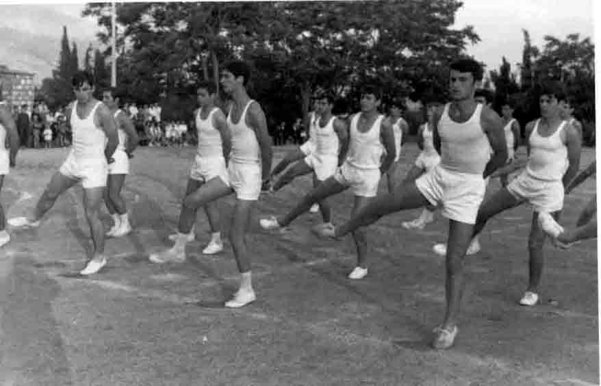 Γυμναστικές επιδείξεις 1969 ή 70, από αριστερά στην πρώτη γραμμή ο Παύλος Τσάνης, Θανάσης Καραπάνος, Φόρης Θεοδώρου. Πίσω Φίλιππος Καλύβας,;, Σταύρος Στράτης, Φώτης Σιούτης…