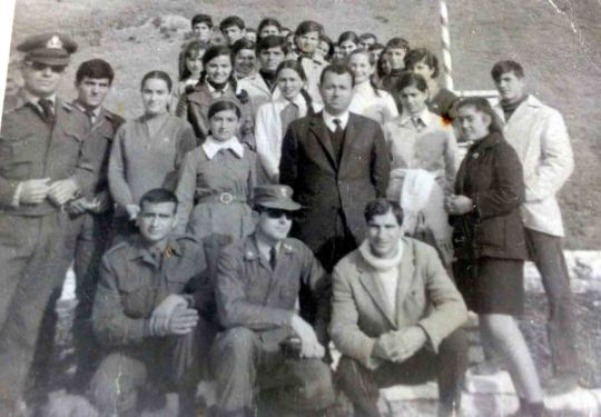 μια φωτογραφία που μου έστειλε ο φίλος Δημήτρης Μπαλάγκας, την αναρτώ πάραυτα- μιας και είναι επετειακή 19 Δεκέμβρη 1970- η Χορωδία του Γυμνασίου επίσκεψη σε φυλάκιο. Όρθιος ο καθηγητής Γιώργος Τσίλης και καθιστός ο καθηγητής Γιάννης Μπαραμπούτης- ο Τζονη. Άλλα μη ρωτάτε…