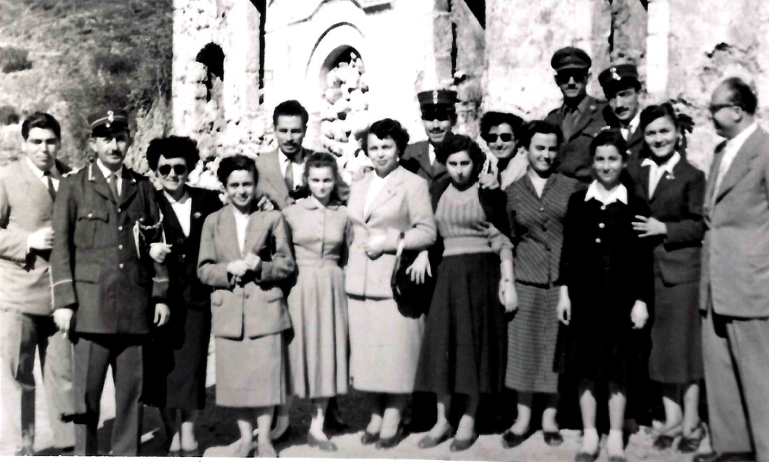 Από αριστερά, Παύλος Φραγκίσκος, Γιώργος (Γάκης) Κύρκος- αρχιμουσικός τότε, Όλγα Κύρκου, Γεωργία Διαμάντη, Χρυσόστομος Ζούλας,;, Φωτούλα, Φραγκίσκου, Πίπης Φραγκίσκος- με τη στολή της Φιλαρμονικής, δίπλα του Πίπη η Ευτυχία Ζούλα και εμπρός η Νανά Ζούλα, Χόρη Αλεξίου, Μπούλα Αλεξίου,;, Θόδωρος Καραγιάννης- με τη στολή της Φιλαρμονικής και μάλλον ο Γρηγόρης Οικονόμου