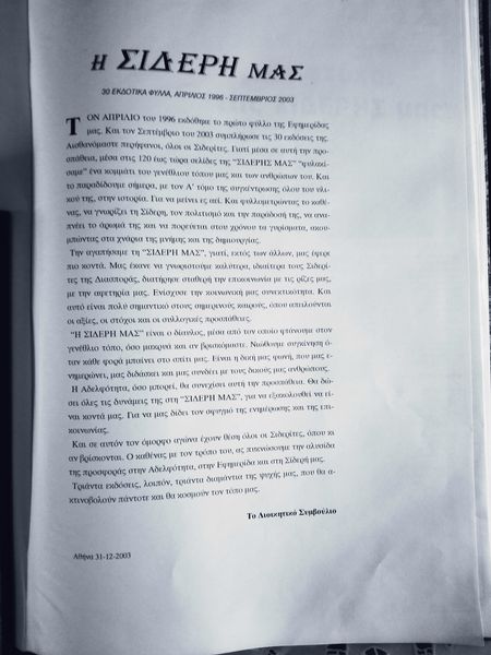 Παίρνοντας στα χέρια μου,μετά από μεγάλη προσμονή,τους δύο τόμους με τα 100 πρώτα τεύχη της εφημερίδας μας συγκινήθηκα πολύ.Ξαναέζησα στιγμές και γεγονότα του χωριού,θαύμασα μέσα από το φίλτρο του χρόνου τις κοπιαστικές προσπάθειες όσων δημιούργησαν αυτά τα τεύχη,όσων τα συγκέντρωσαν και συντήρησαν συμπυκνωμένες μνήμες γεγονότα και καταστάσεις. Πολλά