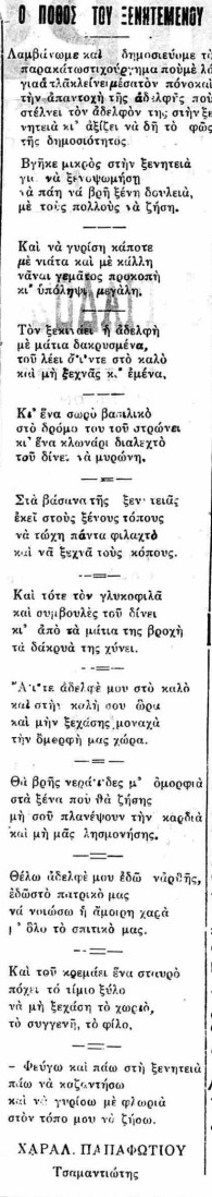 Ένα ποίημα που έγραψε πριν 87 χρόνια ο Χαράλαμπος Παπαφωτίου- ξενιτεμένος στην Αμερική Τσαμαντιώτης- το οποίο δημοσιεύθηκε στη εφημερίδα ΘΕΣΠΡΩΤΙΑ το 1936. Προφανώς το ποίημα ήταν για την αδελφή του Άννα Μαλάμη- Παπαφωτίου. Πόσο ευαισθησία είχε εκείνος ο κόσμος…
