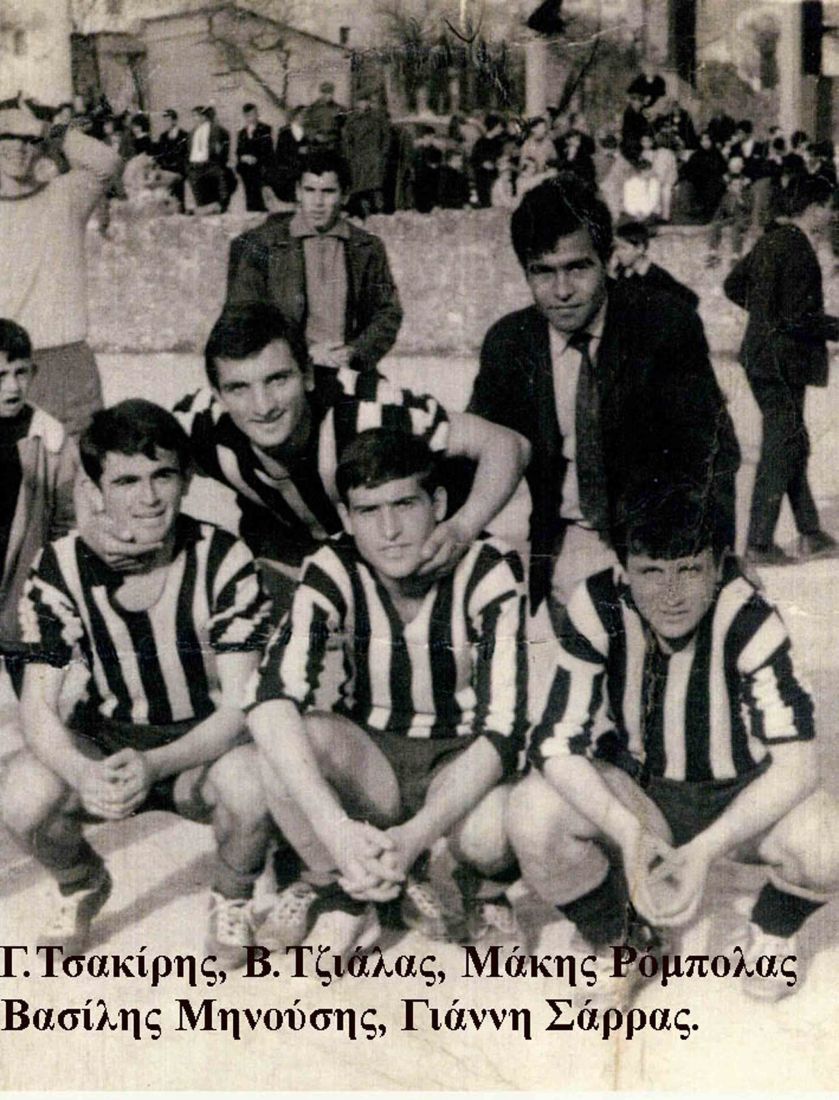 Μια φωτογραφία στου ’60 τη δεκαετία- Τρια αστέρια του ΑΡΗ Φιλιατών, απο αριστερά: Γ.Τσακίρης, Βασ. Τζιάλας, Μάκης Ρόμπολας και δίπλα τους ο αείμνηστος Μπατσίλης- Βασίλης Μηνούσης, κορνετίστας και του Ντέμη Ρούσου. Πίσω τους νομίζω είναι ο Βασίλης Βασιάδης και στον τοίχο εκατοντάδες θεατές- στο παλιό γήπεδο Φιλιατών. Ο όρθιος αριστερά που βάζει το χέρι στον πρόσωπο για τον ήλιο μοιάζει με τον Κώστα τον Παπαγεωργίου!