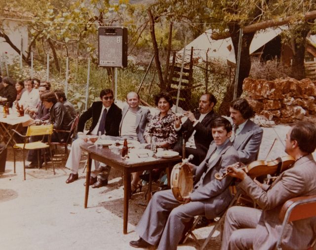 Μια φωτογραφια μιας αλλης εποχης απο μεσημεριανο γαμο καπου εδω στα μερη μας…Την πηρα απο την Παγωνα Αθανασιου-Χαλκια….Εμενα με γυριζει πολλα χρονια πισω,στις πρωτες ταξεις του δημοτικου…Σαν πιτσιρικαδες περιμεναμε πως και πως κανεναν γαμο η πανηγυρι…Τοτε οι γαμοι γινοντουσαν εξω στα χωραφια…Απο αριστερα με τα γυαλια ο Πανος Αθανασιου,ο Γιωργος Κουρτης,η Παγωνα,ο Παραμυθιωτης κλαρινιστας Παυλος Μπουκαλης και ο Νυσης με το ντεφι…Τον Κουρτη και τον Μπουκαλη τους γνωριζαμε γιατι ειναι Παραμυθιωτες…Αργοτερα μεγαλωνοντας ειχα την χαρα να γνωρισω και το ζευγος Παγωνα και Πανο Αθανασιου οπως και αλλους αξιολογους μουσικους και τραγουδιστες που συνεχιζουν να βγαινουν καινουριοι και να κρατουν την παραδοση και εμεις να γλενταμε….Θυμαμαι οτι παντα σε ολα τα γλεντια , υπηρχε και το τραπεζακι γεματο με ψητο και ποτα μπροστα απο το συγκροτημα….Και αν κανεις απο τους καλεσμενους μεθουσε θα εσπαγε και κανενα μπουκαλι πανω στο κεφι…!!!..Αυτη ειναι η Ηπειρος..!!!