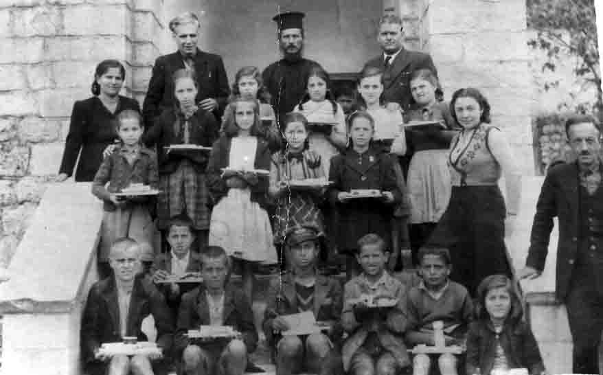 Εισοδο πάνω Δημοτικου Σχολείου 1947, στην άκρη δεξιά ο δάσκαλος Κων. Γκούντας
