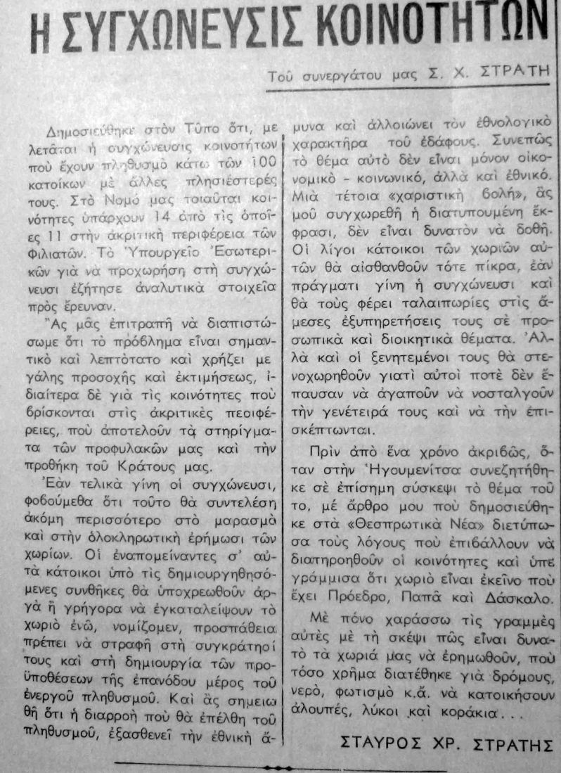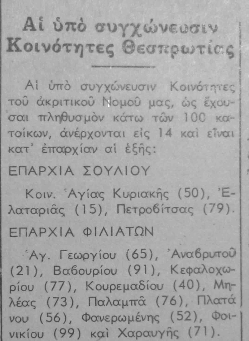 Από την εφημερίδα ΘΕΣΠΡΩΤΙΚΑ ΝΕΑ και τον αείμνηστο συμπολίτη Σταύρο Στράτη- δημοσιογράφο, μαθαίνουμε για μια κίνηση της τότε κυβέρνησης. Τότε οι κοινότητες του δήμου Φιλιατών που είχαν πληθυσμό κάτω από 100 κατοίκους ήταν 14, σήμερα είναι κοντά στις 40- από τις 46. Βέβαια για μέτρα ανάσχεσης της ερημοποίησης ούτε λόγος. Το τραγικότερο στην ανοργανωσιά του ελληνικού κράτους είναι ότι καταργημένες και μη, κοινότητες χωρίς κάτοικο, έχουν… Πρόεδρο! Σε κάποιες από αυτές υπήρχαν και εκλογικά κέντρα στις τελευταίες εκλογές.