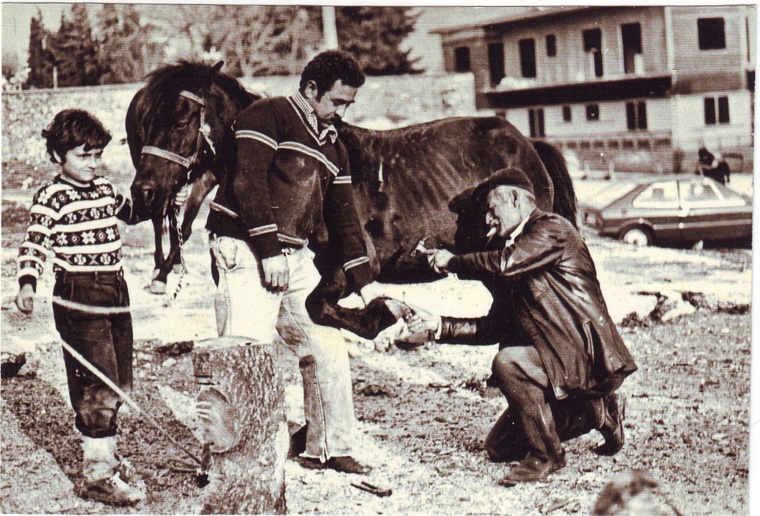 Ο Γιάννη Κολιομύτες πεταλώνει, ο Βαγγέλης Στέφος (Τζες) κρατάει το πόδι του αλόγου κι ο γιός του το άλογο- εξω απο το παλιό Γυμναστήριο- πριν 40 χρόνια…