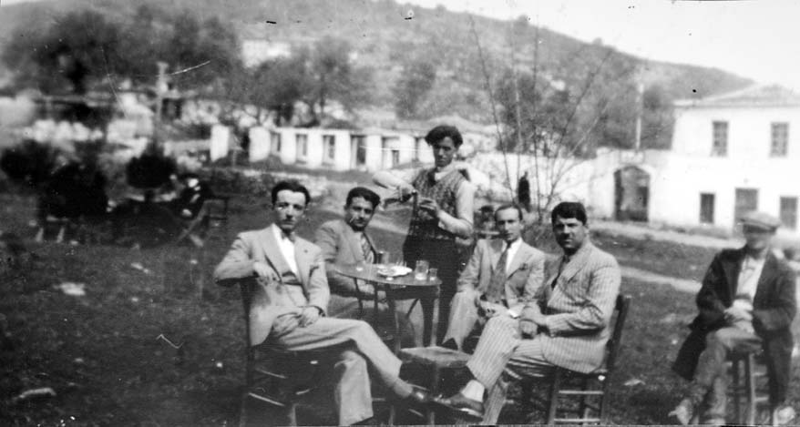 Εκεί που είναι σήμερα ο Άγιος Δημήτριος ήταν προπολεμικά η κεντρική πλατεία των Φιλιατών. Εκεί και το Δημαρχείο, μια παράγκα από πισόχαρτο που αργότερα έγινε Λέσχη Αξιωματικών, μετά στεγάσθηκε η Φιλαρμονική και τέλος έγινε ο Άγιος Δημήτριος. Στην εικόνα δεν θυμάμαι ποιοι εικονίζονται… η κυρία που μου έστειλε την φωτογραφία με ξέχασε- νομίζω ο ένας είναι ο Σταύρος Κοτσώνης… Πίσω από την παρέα διακρίνεται το κτίριο Γεωργίου Σιούτη, σήμερα είναι Πνευματικό Κέντρο της εκκλησία- τότε ήταν το καφέ ΝΕΟΝ.