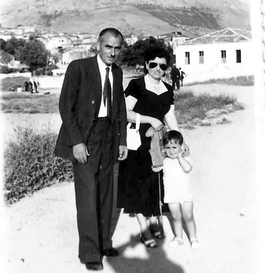 Μια φωτογραφία γύρω στο 1953, εκεί όπου σήμερα είναι το Πάρκο του ΟΤΕ. Ο Γιάννης Μικρούλης η σύζυγος του Ευτυχία κι ο γιός τους Σωτήρης- από το αρχείο της Τασίας Νέτη. Αριστερά μόλις που διακρίνει κανείς το πηγάδι πού έπαιρναν νερό και κόσμο σε αυτό- το πηγάδι που υπάρχει και σήμερα έξω από τον περίβολο του Γυμνασίου. Το κτίριο δεξιά ήταν το τότε Γυμνάσιο και σήμερα στη θέση του υπάρχει το κτίριο του ΟΤΕ.