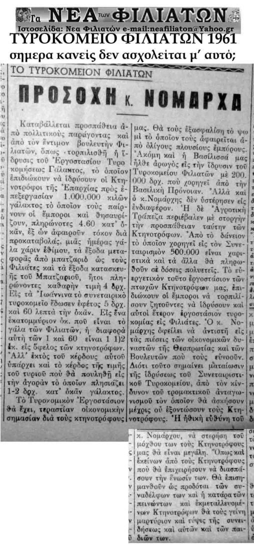 Απο την εφημερίδα ΘΕΣΠΡΩΤΙΚΑ ΝΕΑ το 1961 και τον αγώνα για την ίδρυση του Τυροκομείου
