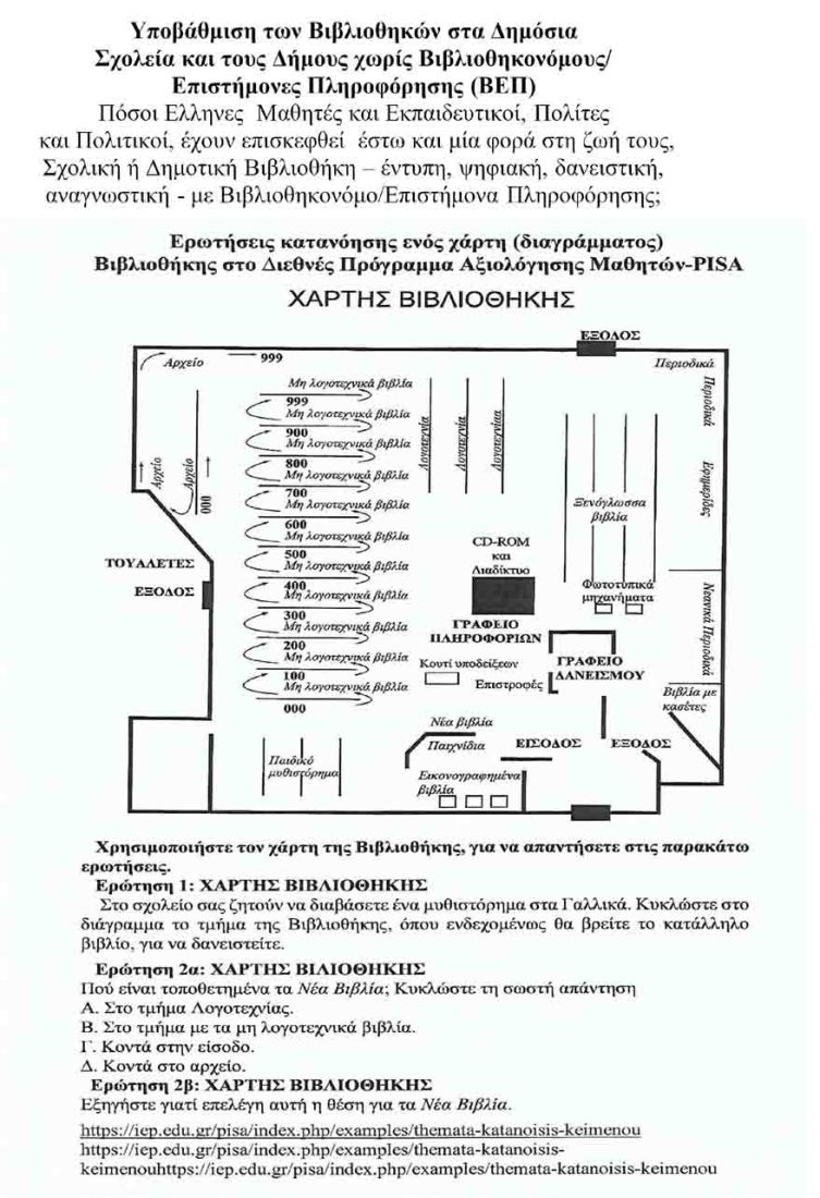 Η ευθύνη της ανυπαρξίας ή της υπολειτουργίας των Βιβλιοθηκών χωρίς Βιβλιοθηκονόμους/ Επιστήμονες Πληροφόρησης, της απαξίωσης των Δωρεάν χορηγουμένων κρατικών βιβλίων ως δημοσίων, πνευματικών οικονομικών και περιβαλλοντικών αγαθών, βαραίνει όλες τις Κυβερνήσεις αλλά και τις περισσότερες Τοπικές Διοικήσεις. Άραγε, πόσοι Ελληνες Μαθητές και Εκπαιδευτικοί, Πολίτες και Πολιτικοί, αυτήν την εβδομάδα, αυτόν τον μήνα, το εξάμηνο, την πενταετία, τη δεκαετία, έστω μια φορά στη ζωή τους, έχουν επισκεφθεί μία Σχολική ή Δημοτική Βιβλιοθήκη – έντυπη και ψηφιακή, δανειστική και αναγνωστική- με Βιβλιοθηκονόμο/ Επιστήμονα Πληροφόρησης; Χωρίς σχετική εμπειρία, πώς ν’ ανταποκριθούν οι 15χρονοι Μαθητές στις απαιτήσεις διεθνών οργανισμών αξιολόγησης, όπως η PISA, οι οποίοι θεωρούν αυτονόητη την διδακτική, μαθησιακή, ερευνητική, διαθεματική, διεπιστημονική χρήση πολλών βιβλίων και άλλων πηγών γνώσης στον πολυχώρο Βιβλιοθήκης του Σχολείου και του Δήμου;