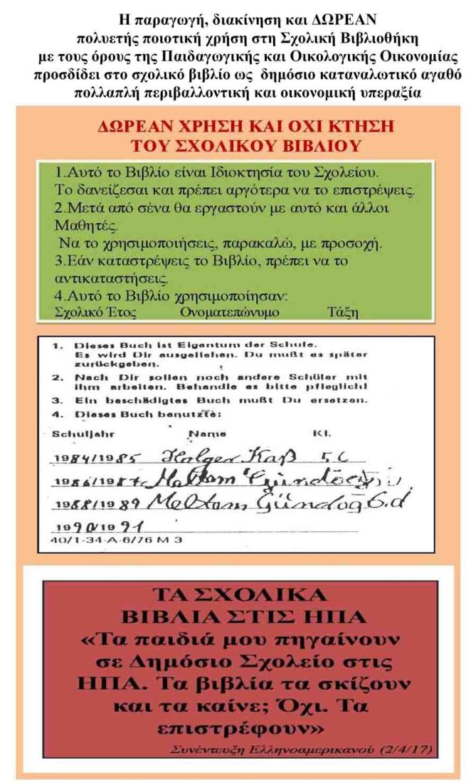 Στο πλαίσιο αυτό είναι αδιανόητες οι κομματικές αντιπαλότητες σχετικά με το δίλημμα βαριοπούλες ή Βιβλιοθήκες στα Δημόσια Σχολεία, τα Πανεπιστήμια και τις Γειτονιές. Η Ελλάδα είναι η μοναδική χώρα στον κόσμο που χορηγεί τα σχολικά βιβλία και τα πανεπιστημιακά συγγράμματα δωρεάν για ιδιοκτησία και όχι για ιδιοχρησία με παιδαγωγικούς, οικονομικούς και περιβαλλοντικούς όρους και προϋποθέσεις. Στις άλλες χώρες η παραγωγή, διακίνηση και ΔΩΡΕΑΝ πολυετής ποιοτική χρήση των βιβλίων στις Βιβλιοθήκες με όρους Παιδαγωγικής και Οικολογικής Οικονομίας προσδίδουν στα βιβλία ως δημόσια αγαθά πολλαπλή πνευματική, πολιτιστική, περιβαλλοντική και οικονομική υπεραξία