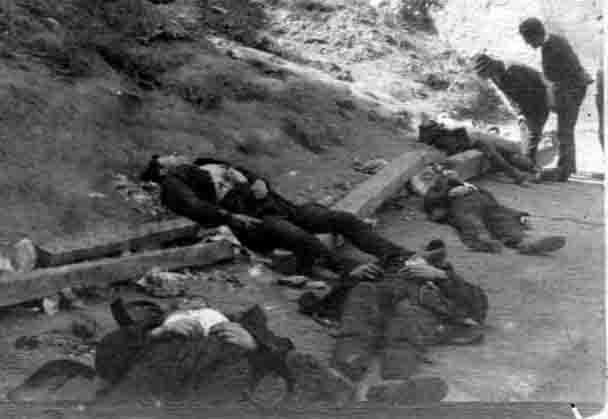 Οι λήσταρχοι εγκληματίες Ρεντζαίοι Θύμιος και Γιάννης και οι συνεργάτες τους Ευάγγελος Κόκαλης, Κωνσταντίνος Καψάλης και Φίλιππας Διαμάντης κείτονται νεκροί μετά την εκτέλεσή τους στο χώρο έξω απο το παλιό φρούριο της Κέρκυρας.