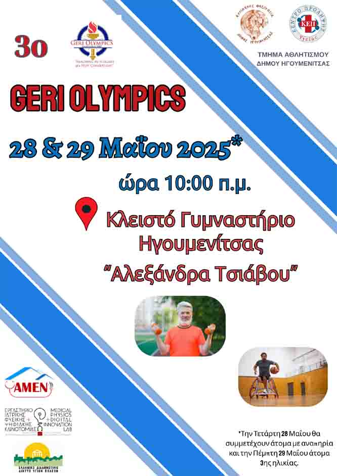 Το Τμήμα Αθλητισμού και το ΚΕΠ Υγείας του Δήμου, συνεργάζονται και φέτος με τη Στέγη Καϊμακλίου «Αρχάγγελος Μιχαήλ» (ΑΜΕΝ), το Εργαστήριο Ιατρικής Φυσικής και Ψηφιακής Καινοτομίας του Α.Π.Θ. και το Ελληνικό Διαδημοτικό Δίκτυο Υγιών Πόλεων (ΕΔΔΥΠΠΥ) και διοργανώνουν τα “Geri Olympics”, μια γιορτή αθλητισμού με στόχο τη δραστηριοποίηση, την κοινωνικοποίηση, την ψυχαγωγία των συμμετεχόντων αλλά και την ανάδειξη της αξίας της ενεργούς γήρανσης, μέσα σε ένα πλαίσιο σεβασμού και διαφορετικότητας.