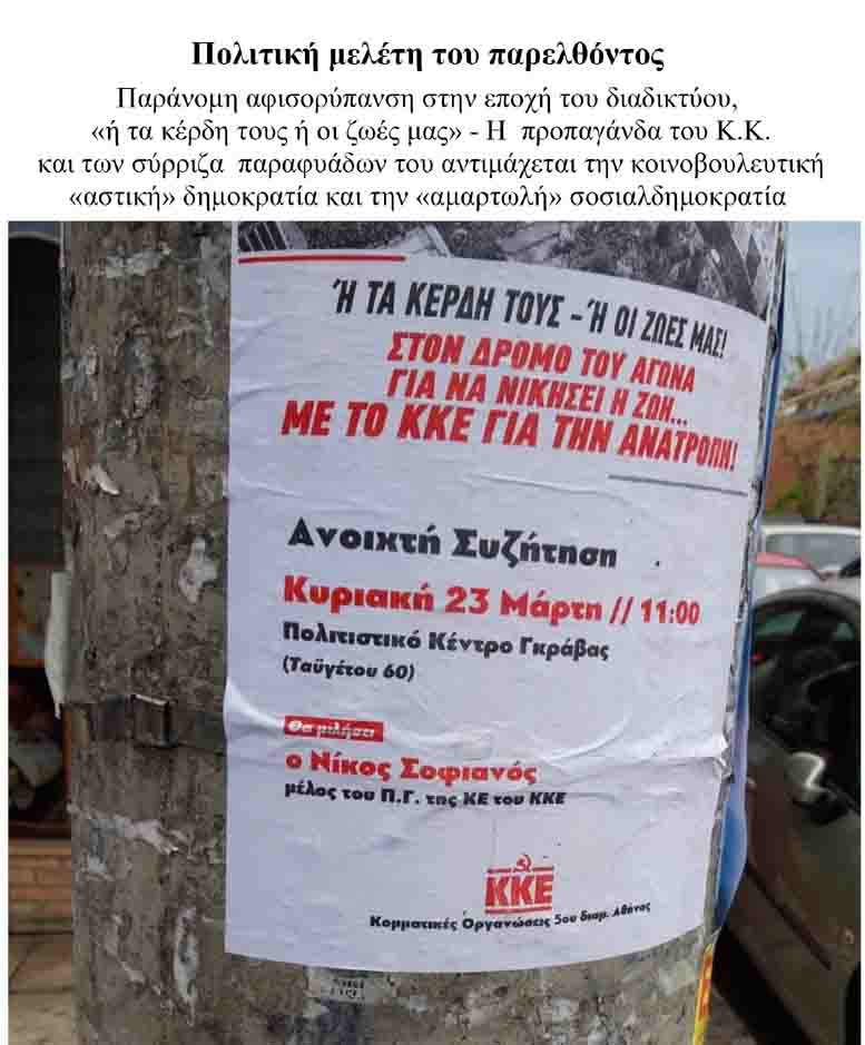 1. Η προπαγάνδα του Κ.Κ. και των σύρριζα παραφυάδων του με επαναστατική γυμναστική συχνών απεργιών και αντικοινωνικών διαδηλώσεων στους δρόμους και τις πλατείες καταγγέλλει το «σάπιο σύστημα» του κοινοβουλευτισμού· αντιμάχεται την «αμαρτωλή» σοσιαλδημοκρατία και την κοινοβουλευτική «αστική» δημοκρατία.