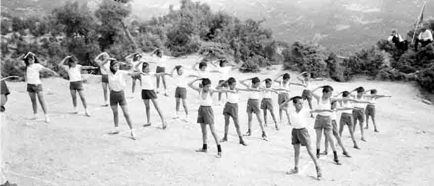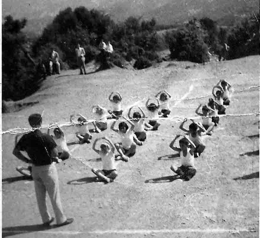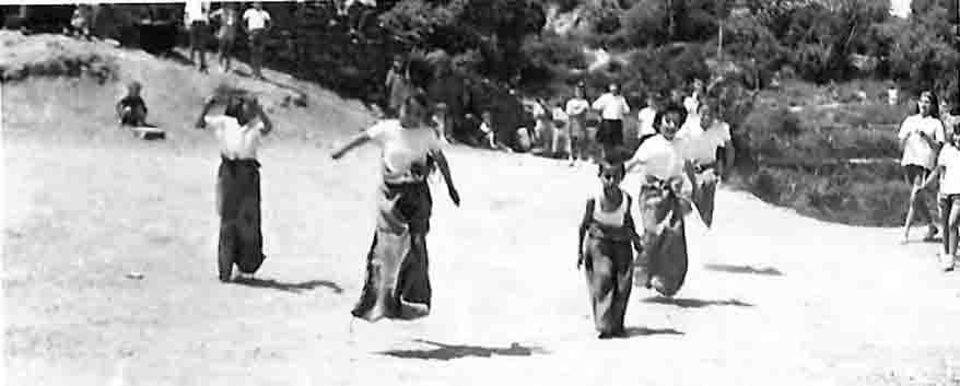 Με αυτόν τον τρόπο πηγαίναμε στο τέλος της χρονιάς σε ένα κοντινό «σιάδι», «στο αλώνι το χωματένιο», για τις γυμναστικές επιδείξεις, που τις παρακολουθούσε έκπληκτο όλο το χωριό, που πέρα από τις γυμναστικές ασκήσεις, μη έχοντας όργανα και εξοπλισμό, κάναμε και διάφορα παραδοσιακά αγωνίσματα («ζιακοδρομίες», αγώνας δρόμου με τα πόδια μέσα σε «ζιάκες»- τσουβάλια, σκυταλοδρομίες, αυγοδρομίες με ένα κουτάλι στο στόμα με ένα αυγό πάνω σε αυτό, το «μαντηλάκι», «σκλαβάκι» κλπ.).