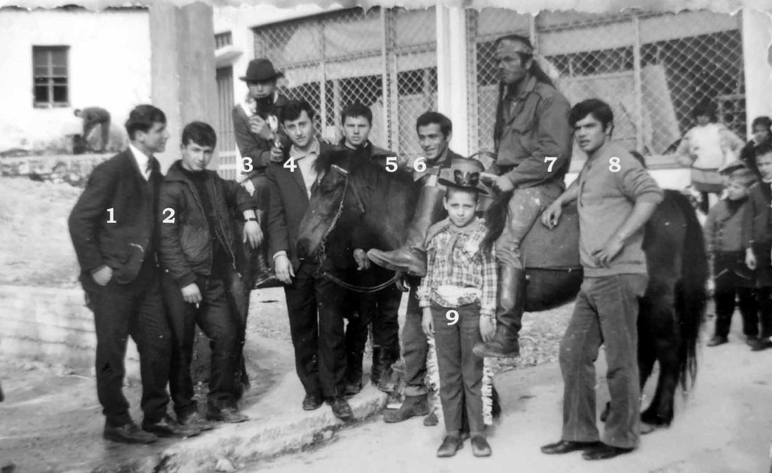 Πιθανον να είναι του 1968, γιατί βλέπω πίσω δεξιά την Εκθεση Επίπλων του αείμνηστο Μιχάλη Κώτση- πατέρα μου- εκεί όπου σήμερα το Ανθοπωλείο της Σωτηρίας. Επίσης, πίσω αριστερα είναι ο Στρατιωτικός Φούρνος- απο το αρχείο Τάσου Καλέση. Απο αριστερά το 1.Σπύρος Τσίτος(Μπίκος), 2Μπίτζας, 3;,4Παύλος Αγγελόπουλος,5Παυλος Μπίτζας (BR), 6Μεμής (Τόβλης),7;, 8Κώστας Ντουρλής (Μαντζαβίνος)…9Τσάγκος…ισως ο Αλέκος; Κάθε διόρθωση δεκτή