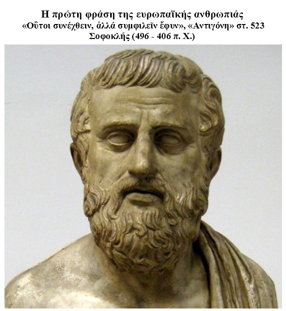Ο Αυστριακός κλασικός φιλόλογος Άλμπιν Λέσκι στην «Ιστορία της Αρχαίας Ελληνικής Λογοτεχνίας» (σελ. 406) τονίζει εμφατικά ότι η φράση της Αντιγόνης, «οὒτοι συνέχθειν, ἀλλά συμφιλεῖν ἔφυν: δεν γεννήθηκα για το κοινό μίσος, αλλά για την κοινή αγάπη και φιλία» («Αντιγόνη» στ.563), είναι η πρώτη φράση της ευρωπαϊκής ανθρωπιάς. Αποτελεί την απάντησή της στην πολιτική βαρβαρότητα, τη δημαγωγία και υποκρισία του Κρέοντα με την απόφασή του να εκδικηθεί και να εκμεταλλευτεί πολιτικά τον νεκρό Πολυνείκη αφήνοντάς τον άκλαυτο και άταφο: «οὔτοι ποθ᾽ ο εχθρός, οὐδ᾽ ὅταν θάνῃ, φίλος» (στ. 522). Με βάση αυτή τη στιχομυθία στους στίχους 562 -563 η σύγκρουση και αντιπαράθεση μεταξύ των δύο πρωταγωνιστών, Αντιγόνης και Κρέοντα, η ουσιαστική διαφορά των πολιτικών αντιλήψεων είναι πρωτίστως για την ισχύ της πολιτικής ανθρωπιάς ή της βαρβαρότητας και δευτερευόντως για τη δύναμη και την εγκυρότητα του άγραφου ή του γραπτού νόμου.
