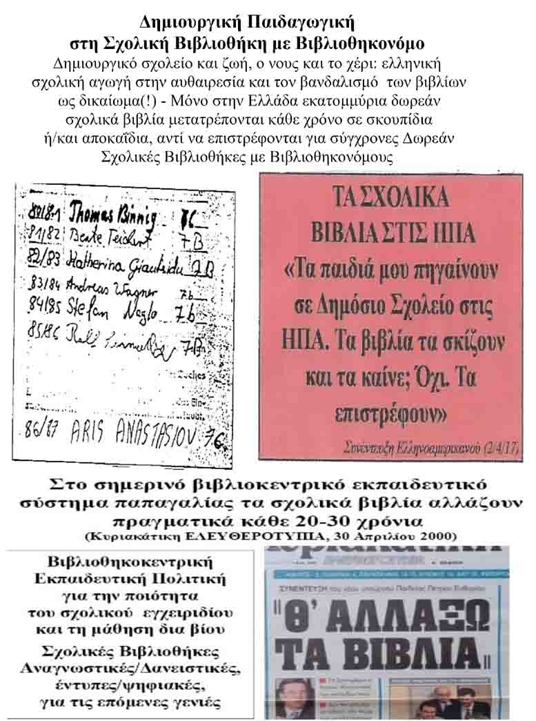 Η δημιουργική Εκπαίδευση με την ερευνητική, βιβλιόφιλη και συνεργατική αξιοποίηση πολλών πηγών γνώσης στη Σχολική Βιβλιοθήκη βοηθά τους μαθητές να αναπτύξουν ολόπλευρα την προσωπικότητά τους και να καλλιεργήσουν όλους τους τύπους των ζωτικών ικανοτήτων παρέχοντας μάλιστα τη δυνατότητα της πολλαπλής επιλογής. Αντίθετα, στο βιβλιοκεντρικό Σχολείο η αυθαίρετη, αντιπαιδαγωγική και αντιπεριβαλλοντική, καταστροφική χρήση του ενός και μοναδικού βιβλίου έχει οδηγήσει στην νοοτροπία να θεωρείται η αυθαιρεσία και ο βανδαλισμός των βιβλίων ως μαθητικό δικαίωμα(!).