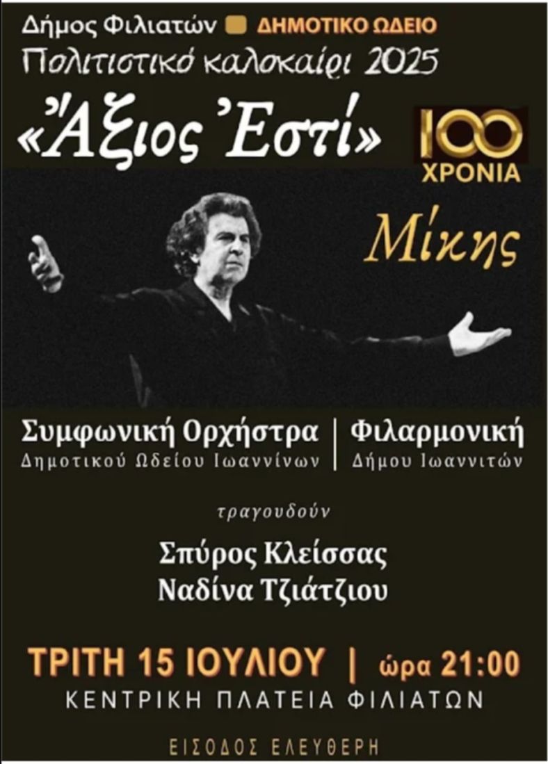 Ο Δήμαρχος Φιλιατών , σας προσκαλεί την Τρίτη 15 Ιουλίου 2025 και ώρα 21:00 στην κεντρική πλατεία Φιλιατών ,στην Συναυλία για τα 100 χρόνια από την Γέννηση του μεγάλου Συνθέτη Μίκη Θεοδωράκη.