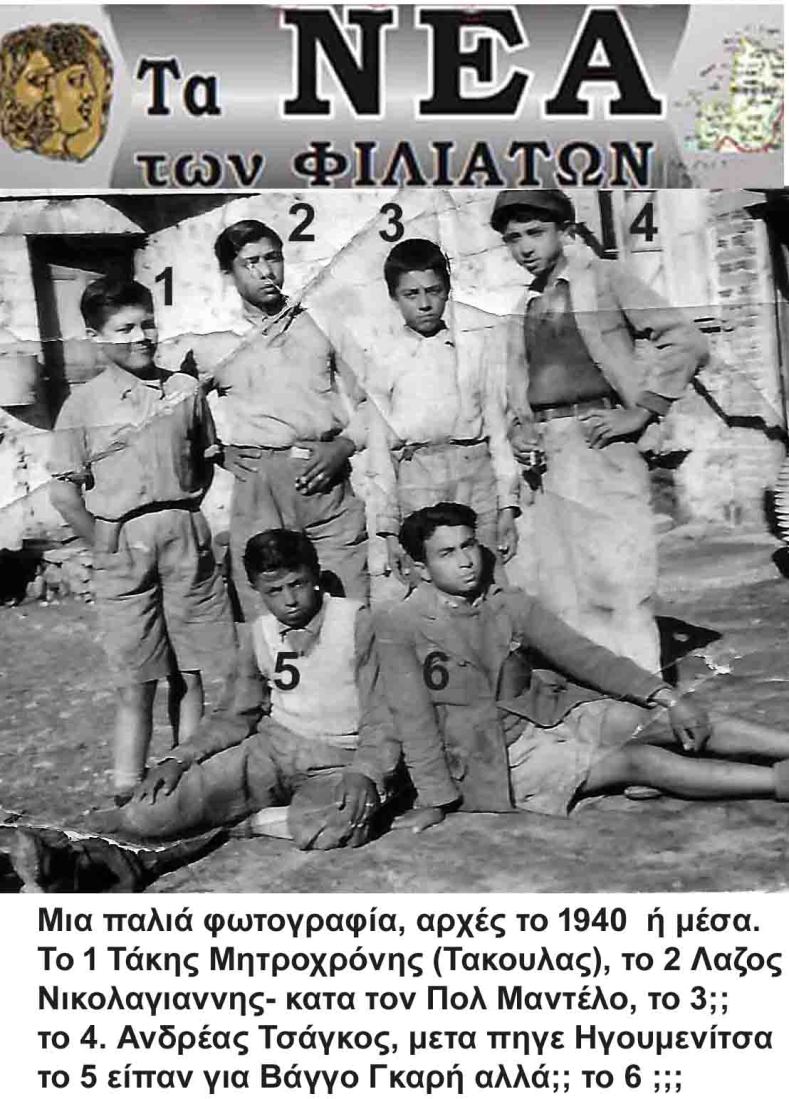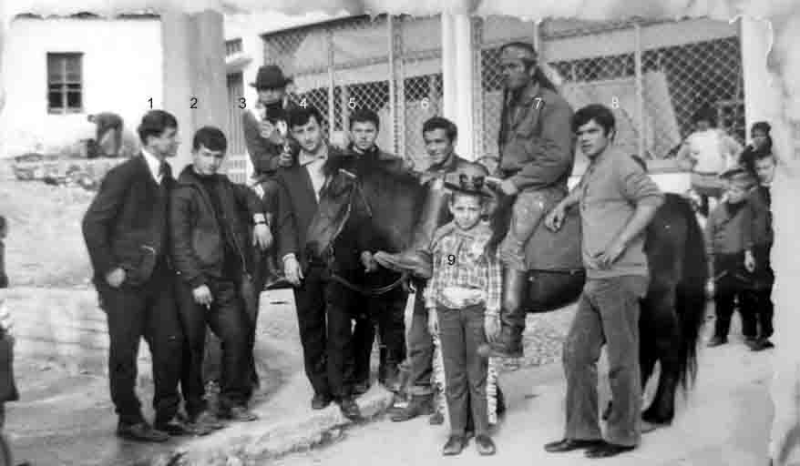 Κάποιες μέρες της Απόκριας ίσως του 1967 όπως γράφει ο Τάσος ο Καλέσης που ανάρτησε την φωτογραφία- πίσω αριστερά είναι ο στρατιωτικός φούρνος που δούλευαν ο Μπούντρης, ο Δήμας και άλλοι, ενώ δεξιά είναι η Εκθεση επίπλων του Μιχάλη Κώτση. Από τους εικονιζόμενους αναγνώρισα το 1.Σπύρος Τσίτος 2.Πέτρος Μπίτζας 3;, 4Παύλος Αγγελόπουλος, 5.Παύλος Μπίτζας 6.Μιμής (Τόβλης), 7;. 8 Ντουρλής (Μάντζας) 9. Τσάγκος ίσως ο Αλέκος.