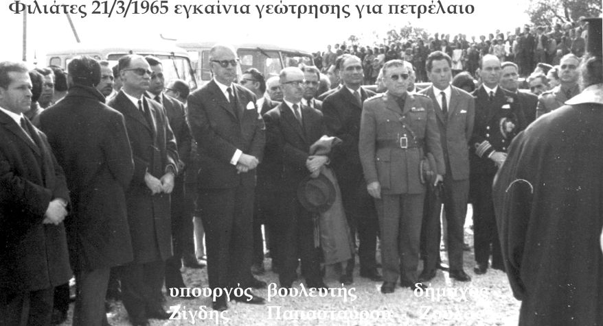 Πριν 60 και χρόνια στους Φιλιάτες, περιοχή Ντούτσε- δυτικά και σύριζα στο σημερινό Στάδιο, έγινε η πρώτη ίσως γεώτρηση στην Ήπειρο για πετρέλαια. Η προσπάθεια ξεκίνησε το 1964, από την ιταλογαλλική εταιρία SNAM- SAIREM και έμεινε στην μέση- αφού την 15/7/1965 έγινε η έναρξη της πολιτικής κρίσης γνωστής ως «Ιουλιανά», που οδήγησε στην πτώση της κυβέρνησης της Ένωσης Κέντρου και τη δημιουργία κυβερνήσεων «αποστατών». Η νέα κυβέρνηση των αποστατών σταμάτησε την χρηματοδότηση και η snam- sairem τα μάζεψε και έφυγε- χωρίς να ολοκληρώσει την εξόρυξη, ως προς το βάθος! Στην 1η φωτογραφία το γεωτρύπανο και οι φοιτητές τότε Νίκος Μπουρδούκης, Χρήστος Παναγόπουλος και ο αείμνηστος Παντελής Κουφάλας- δήμαρχος Φιλιατών μετέπειτα. Στην 2η στα επίσημα εγκαίνια το 1965, ο υπουργός Ζίγδης, ο βουλευτής Θεσπρωτίας Χρ. Παπασταύρου, ο Δήμαρχος Φιλιατών Χρυσ. Ζούλας, στρατιωτικές κλπ αρχές και άλλοι παράγοντες και πολίτες.