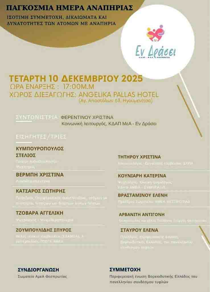 Το Σωματείο ΑμεΑ Θεσπρωτίας θα τιμήσει την Τετάρτη 10 Δεκεμβρίου την ΠΑΓΚΟΣΜΙΑ ΗΜΕΡΑ ΑΤΟΜΩΝ ΜΕ ΑΝΑΠΗΡΙΕΣ (ΑμεΑ) με κύριους ομιλητές τον αντιπρόεδρο της ΕΣΑμεΑ Σπύρο Ζουμπουλίδη και τον πρόεδρο της περιφερειακής Ομοσπονδίας των ΑμεΑ Ηπείρου και Β.Ιονίων Νήσων Σωτήρη Κατσαρό. Η εκδήλωση θα είναι μια υπενθύμιση των Θεσπρωτών για ένα πιο δίκαιο, πιο συμπεριληπτικό και πιο προσβάσιμο κόσμο.