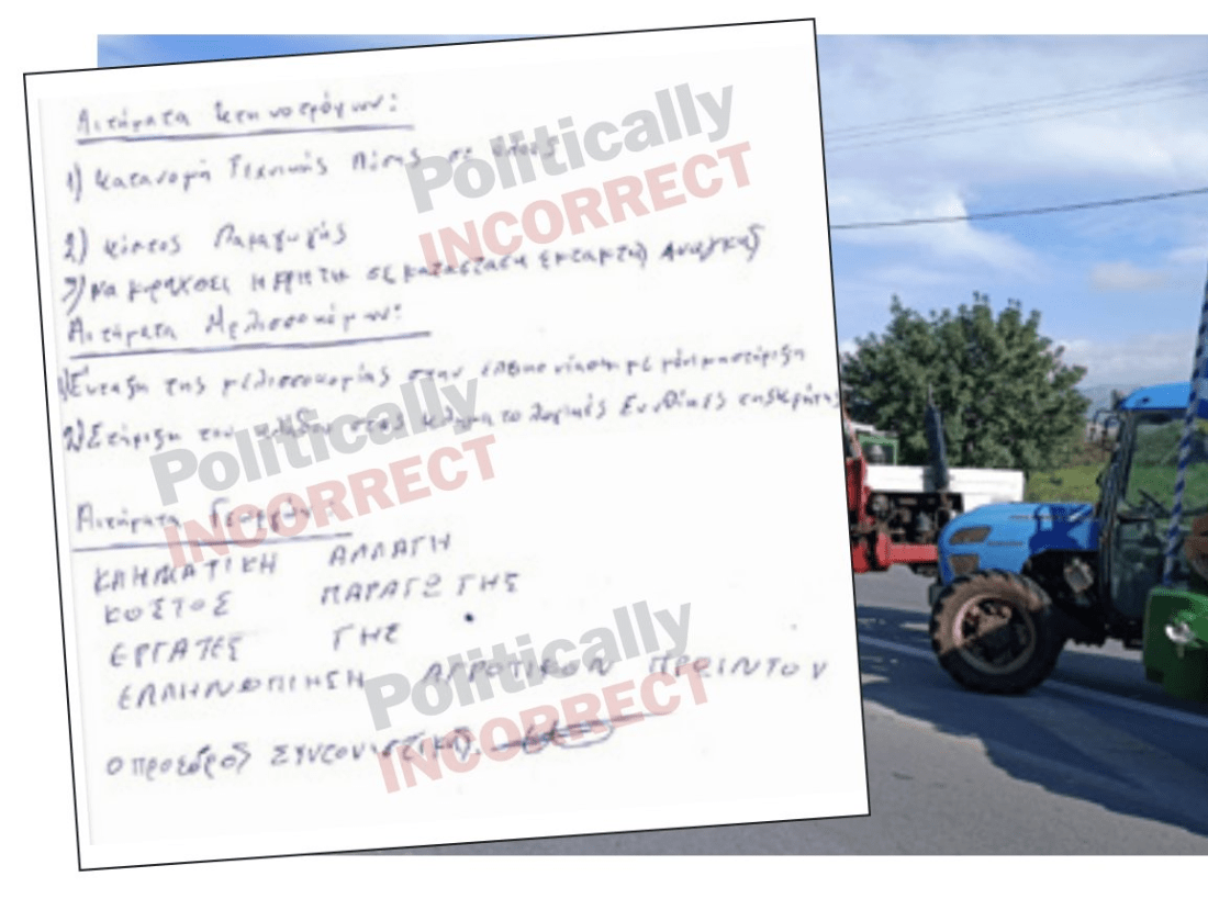 Ψωνίσαμε από σβέρκο που λεν στο χωριό μου. Περιμένεις τώρα από αυτούς τους ανθρώπους να εκσυγχρονίσουν τον πρωτογενή τομέα, για να φτάσουμε την Ολλανδία. Κι άντε να συνεννοηθείς όταν η κλιματική αλλαγή, έστω και ως «κληματική» θεωρείται αίτημα. Κάθε φορά λοιπόν που κάποιος λέει «στηρίζω τους αγρότες στα δίκαια αιτήματά τους», δείξτε του αυτό το χαρτί και ρωτήστε τον τι ακριβώς στηρίζει και με ποιον τρόπο.