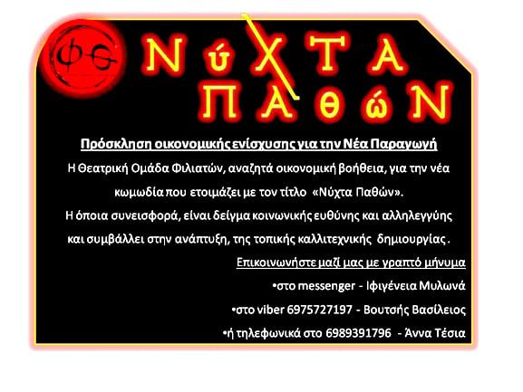 Η Θεατρική Ομάδα Φιλιατών αναζητά οικονομική βοήθεια για τη Νέα κωμωδία που ετοιμάζει με τίτλο «Νύχτα Παθών».