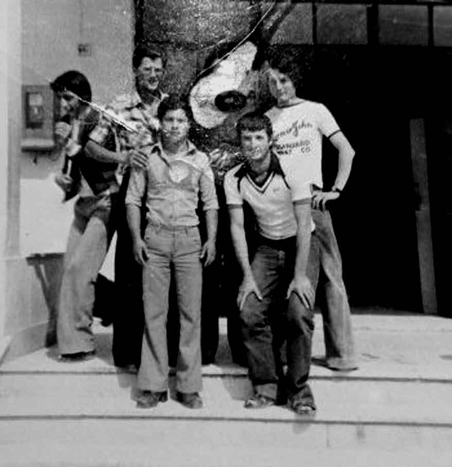 στη φωτό στα σκαλιά της εισόδου του Γυμνασίου: Λάκης Τζιγκος, Γιώργο Μάνος, Γιώργος Δαλλας, Μιγγος και ο Γιώργος Καπρινιωτης