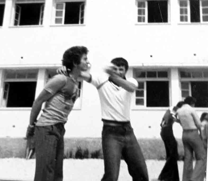 στη φωτό ο Θεόδωρος Λαγός μπουγελώνει τον Οδυσσέα Σταύρου, που χάθηκε νωρίς. Στην κηλίδα είναι ο γυμναστής Δημήτρης Παναγιώτου.