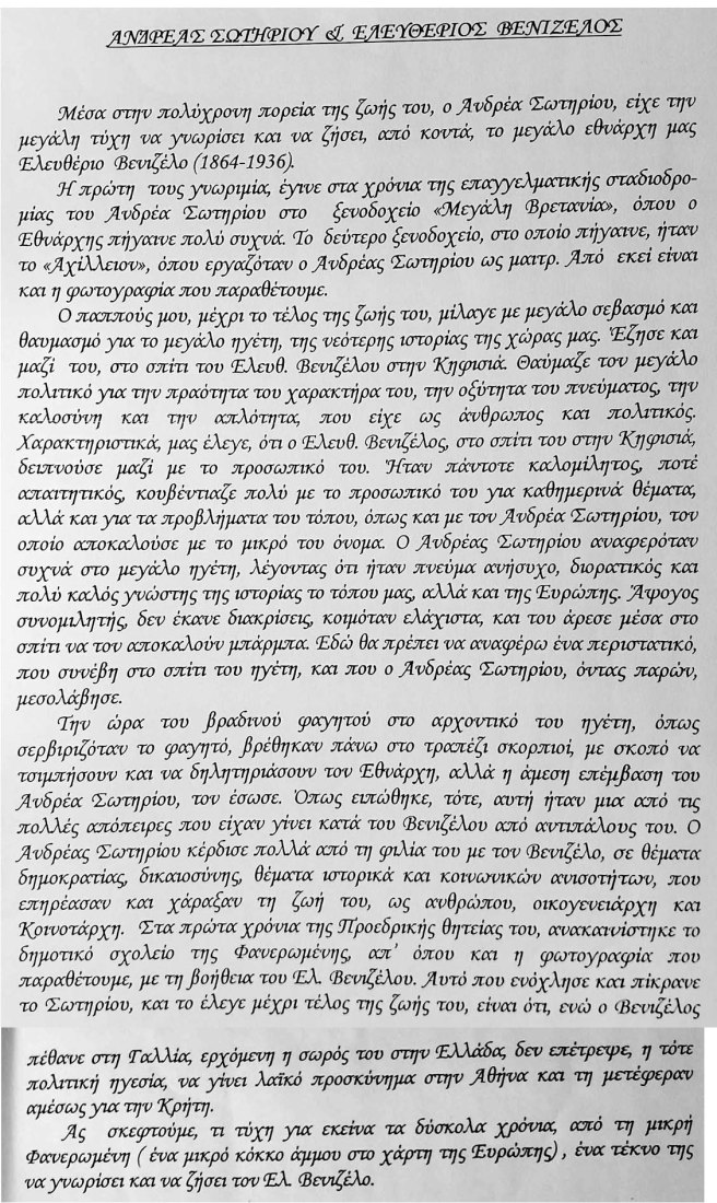 Φέτος συμπληρώνονται 90 χρόνια από το θάνατο του μεγάλου Έλληνα Ελευθέριου Βενιζέλου. Μνημονεύοντας το γεγονός απόγονοι του Ανδρέα Σωτηρίου από τη Φανερωμένη- μας δείχνουν πως ο αείμνηστος παππούς τους είχε γνωρίσει τον Εθνάρχη από κοντά. Ευχαριστούμε για την ανάδειξη του ιστορικού θέματος, τους απόγονους του Ανδρέα Σωτηρίου- Παύλο Ματσούκα και Στέφανο Σωτηρίου!