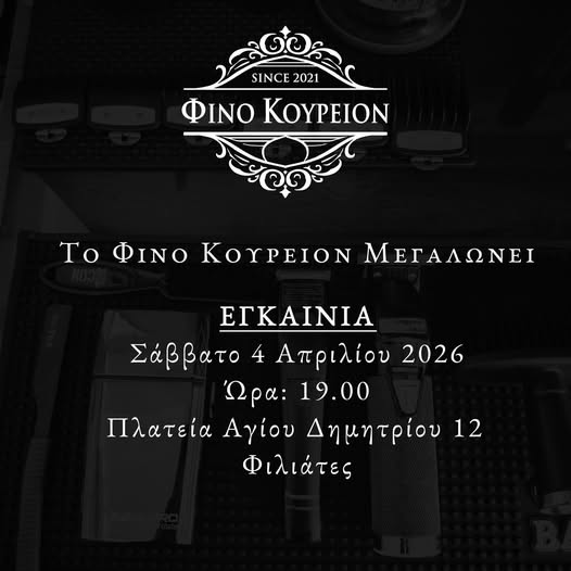 ΑΝΑΡΤΗΣΕ: ΛΙΑΜΙΡΑΣ Αυτό που ξεκίνησε το 2021 στην Ηγουμενίτσα συνεχίζει το ταξίδι του και στους Φιλιάτες Με μεγάλη χαρά σας προσκαλούμε στα εγκαίνια του Φίνο Κουρείον Φιλιάτες, το Σάββατο 4 Απριλίου στις 19.00. Ένα νέο βήμα, με το ίδιο μεράκι και την ίδια αγάπη για τη δουλειά μας