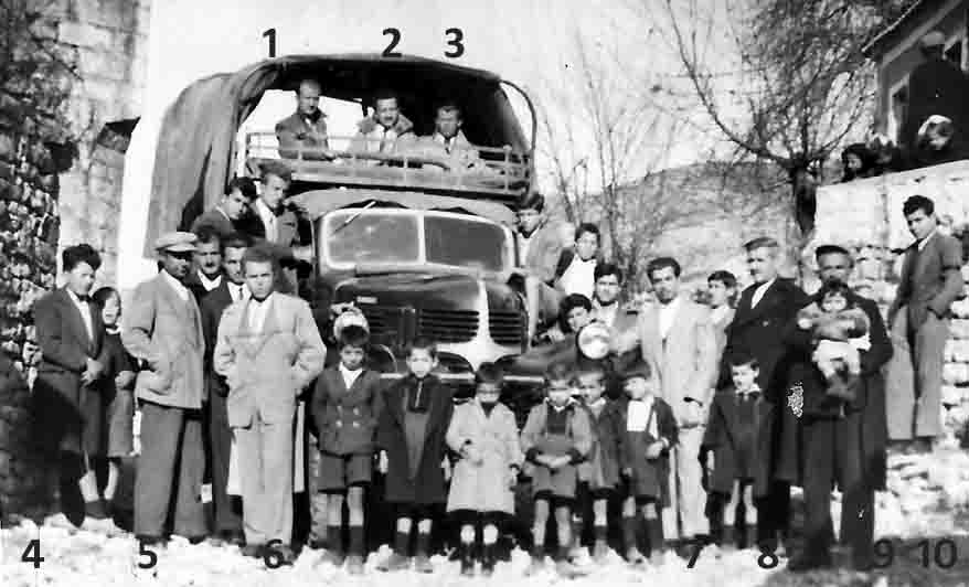 Από αυτην τη ιστορική φωτογραφία αναγνώρισα τον με αρ.5 αείμνηστο Γρανά ιδιοκτήτη και οδηγό του φορτηγού. Στην καρότσα επάνω το 1 μοιάζει του Θόδωρου Κοντογιάννη και το 2 ίσως ο Κολιο Ίδαρης; Στην άκρη δεξιά το 10 μοιάζει του Νίκο Πέγκα…