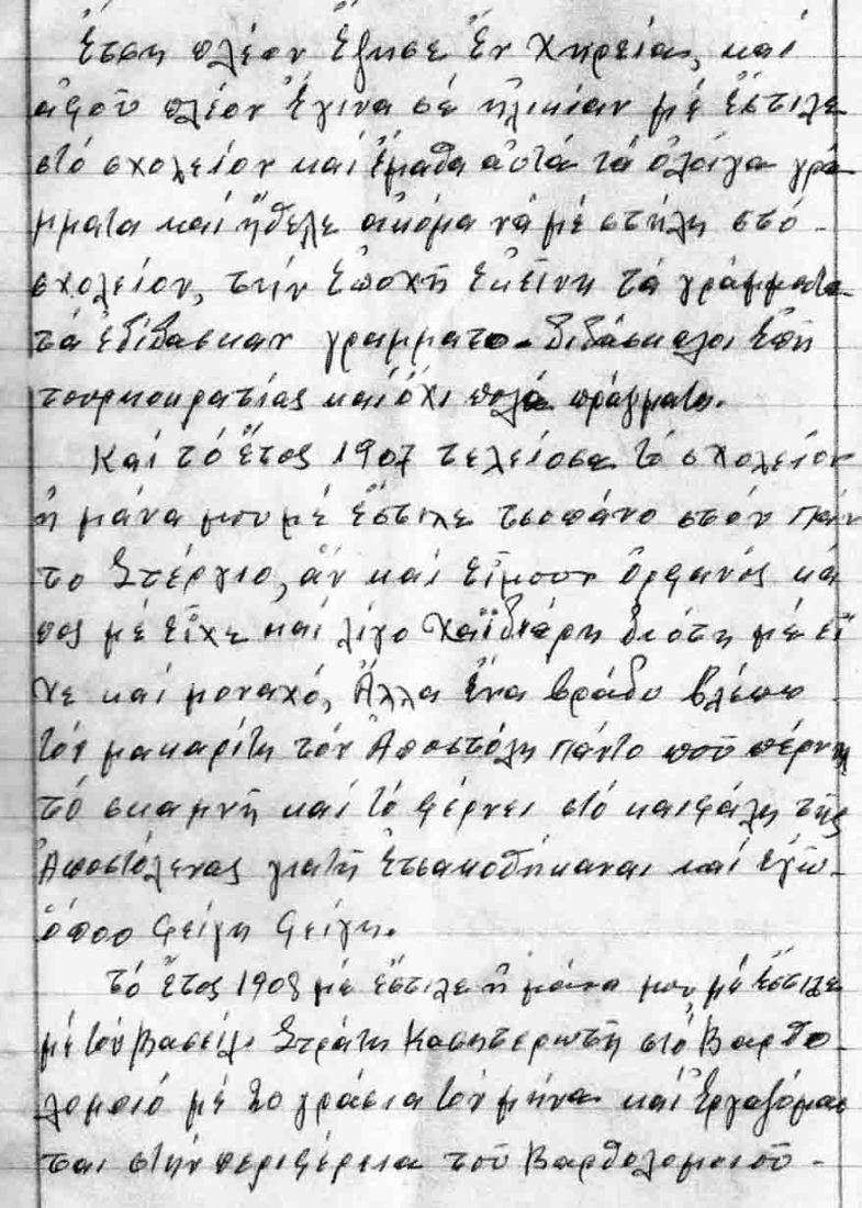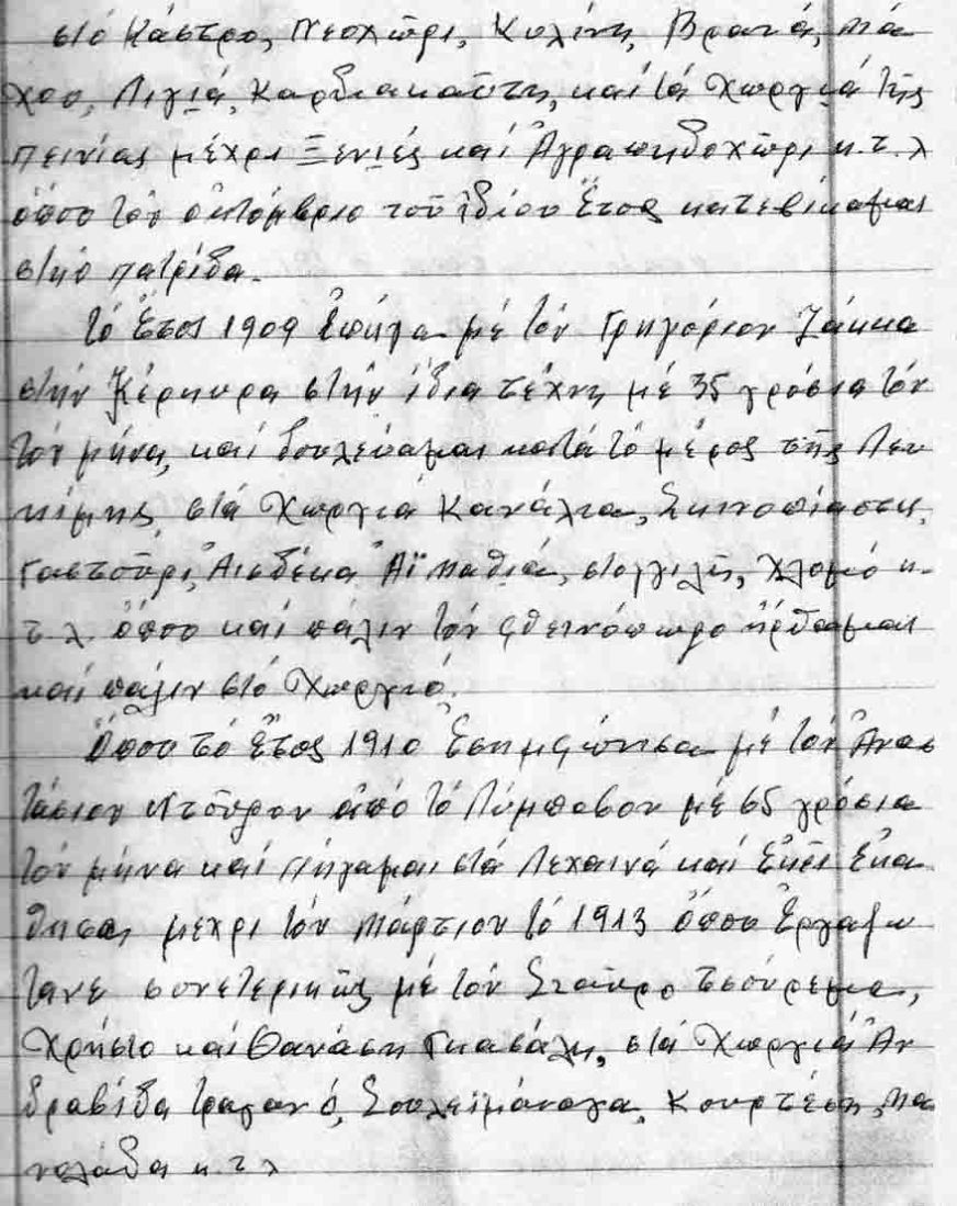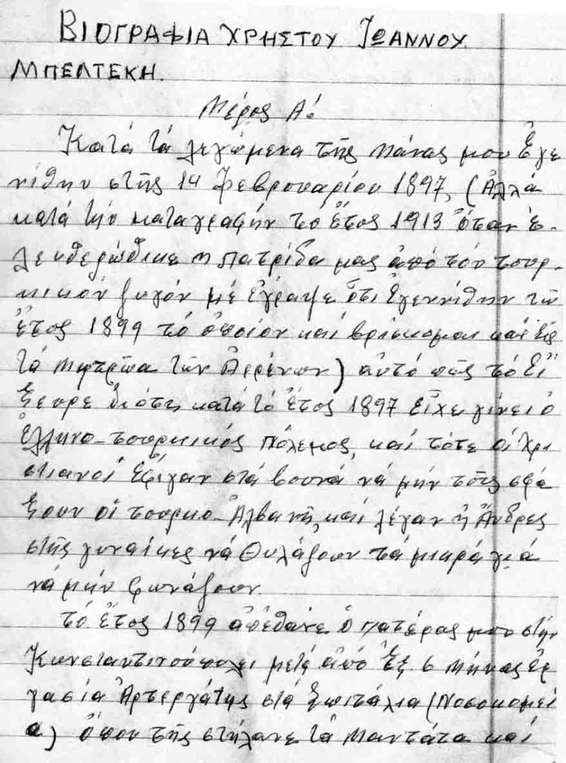 Μια ευχάριστη συνάντηση είχα πρόσφατα με τον φίλο Στέφανο Στράτη- Κοκκινολιθαρίτη αυτοδημιούργητο βιομήχανο επίπλων καλλυντικών, με εξαγωγές στην Ευρώπη και όχι μόνο. Και την ευχάριστη συνάντηση συμπλήρωσε μια ευχάριστη έκπληξη, όταν ο Στέφανος μου έδωσε το ιδιόχειρο βιογραφικό του Χρήστου Ιωάννου Μπελτέκη- παππού του από την μεριά της μητέρα του. Το βιογραφικό του αείμνηστου Χρήστου, του Κοκκινολιθαρίτη που από μικρός πήρε τον δρόμο της ξενιτιάς για να επιβιώσει, είναι μια ιστορία που την έχουν σχεδόν όλα τα σπίτια στον τόπο μας και δύσκολα σ αφήνει αδιάφορο. Δυστυχώς, μεγαλώνουμε τα παιδιά μας και τα χαίρονται τα ξένα κι όπως λέει ο σοφός λαός μας: «Την ξενιτειά, την ορφάνια την πίκρα, την αγάπη, τα τέσσερα τα ζύγιασαν, βαρύτερα ειν’ τα ξένα»! Σήμερα παραθέτω 3 σελίδες από τις 17 συνολικά του όμορφα γραμμένου βιογραφικού- ντοκουμέντου αλλοτινών εποχών του τόπου- το οποίο σε κερδίζει με τον τρόπο γραφής και σε στέλνει σε άλλες εποχές, με άλλους συνειρμούς- όταν ξέρεις ότι ο γράφων έμαθε γράμματα στις αρχές του προηγούμενου αιώνα! Ευχαριστώ τον Στέφανο και καλή ανάγνωση σ’ εσάς!